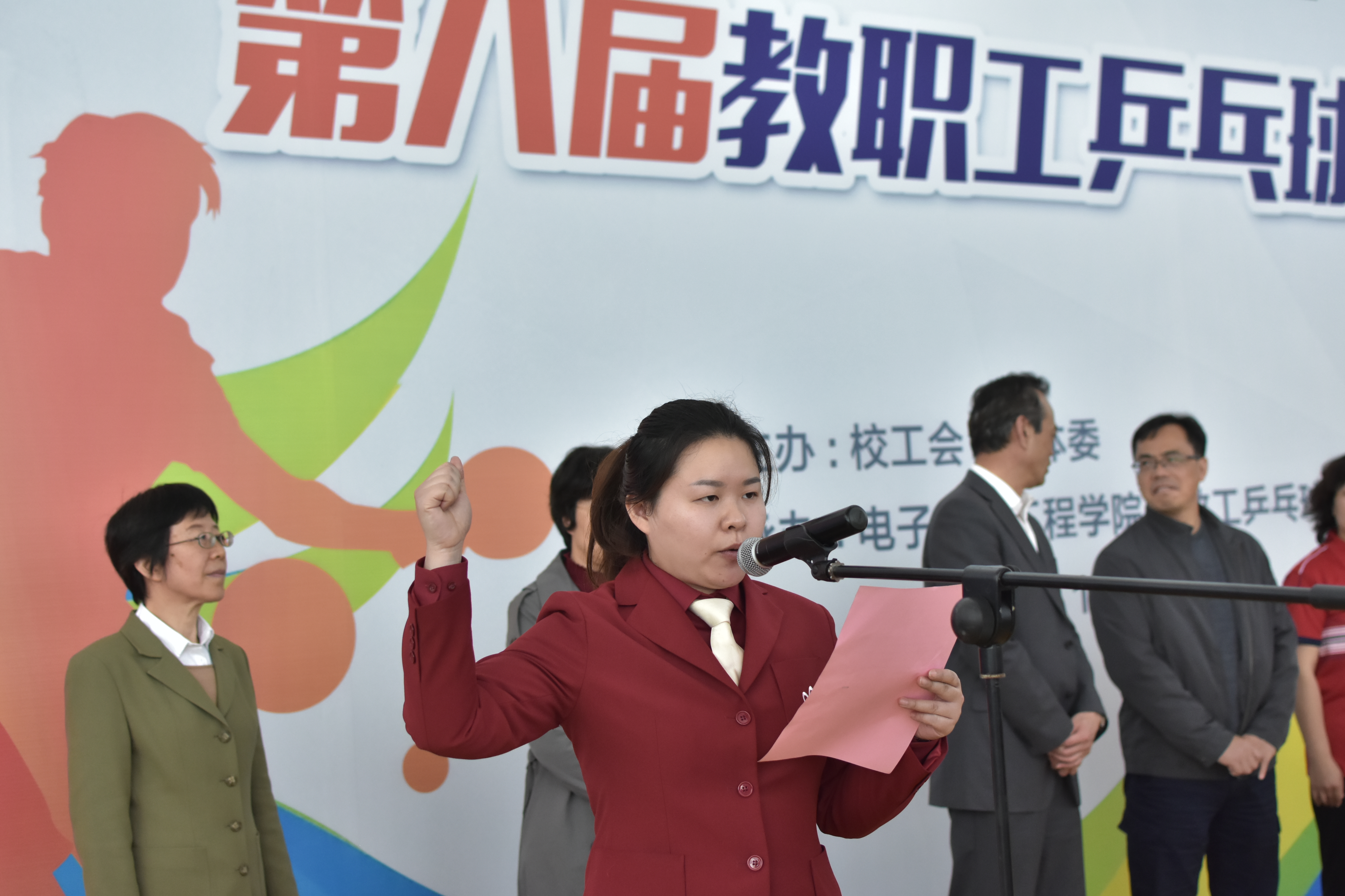 校工会常务副主席柳如荣为比赛致辞,他鼓励教职工们在繁忙紧张的工作之余,让体育锻炼成为良好习惯和生活风尚,以旺盛的精力永葆工作热情。同时也希望每位运动员都能安全参赛、文明参赛,赛出成绩、赛出风格,彰显工程大教职工健康、阳光、向上的精神风貌。随后运动员代表与裁判代表分别宣读誓词,校体育部部长张建新宣布比赛开赛,并为比赛开球。