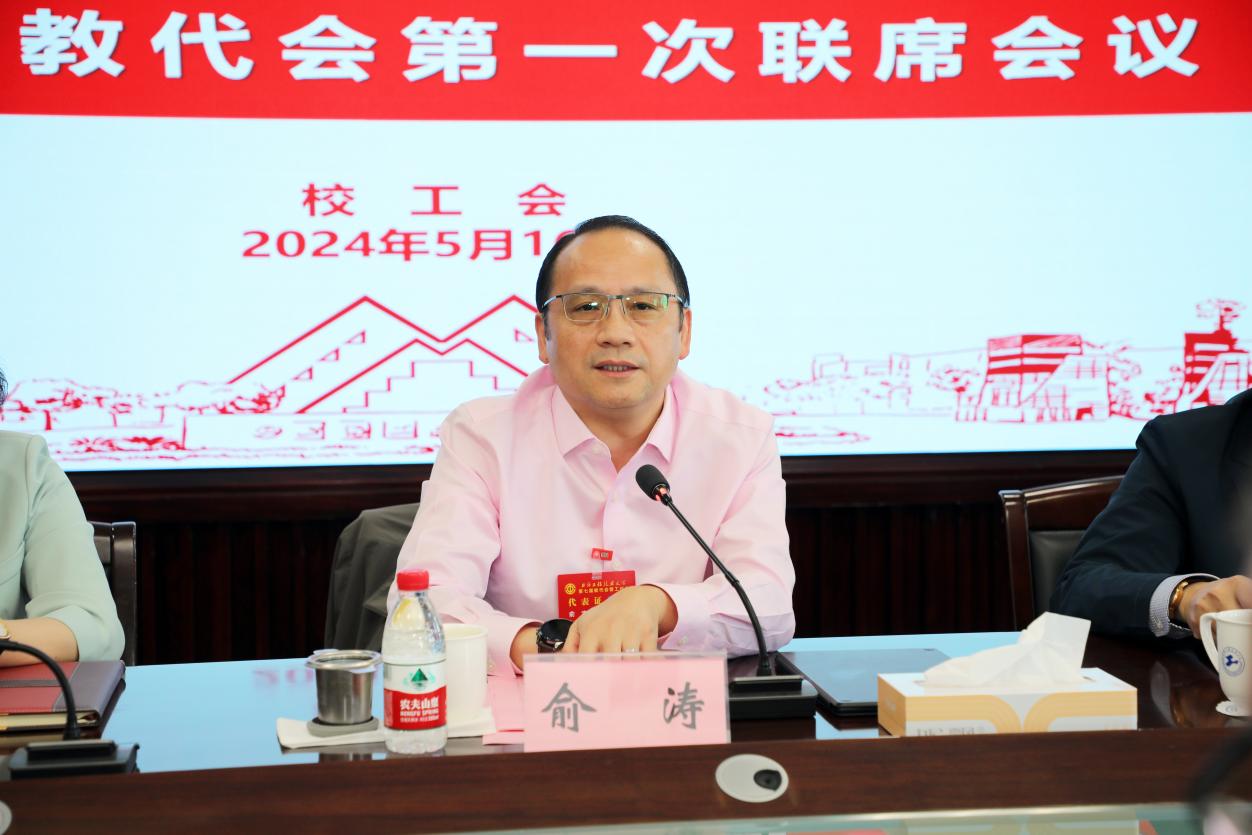 为有序推进学校第七届教代会暨工代会第一次会议各项工作开展,为即将召开的大会闭幕式做好准备,5月16日下午,学校第七届教代会第一次联席会议在行政楼506会议室顺利召开。校党委副书记、校长俞涛,校党委副书记、大会执行主席史健勇,校党委副书记、副校长朱晓青出席会议,学校第七届教代会主席团成员、代表团(组)长参加会议。会议由校党委副书记、大会执行主席史健勇主持。