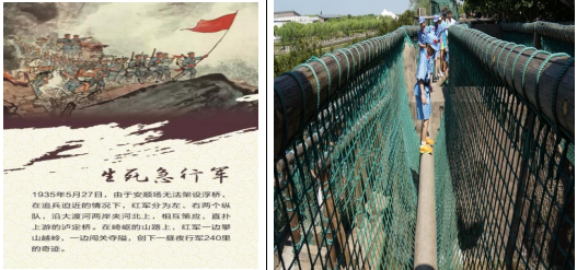 第一站:“红军足迹园”—第二站:“生死急行军”—第三站:“飞夺泸定桥”—第四站:“致敬伟人”—第五站:“同心协力过草地”