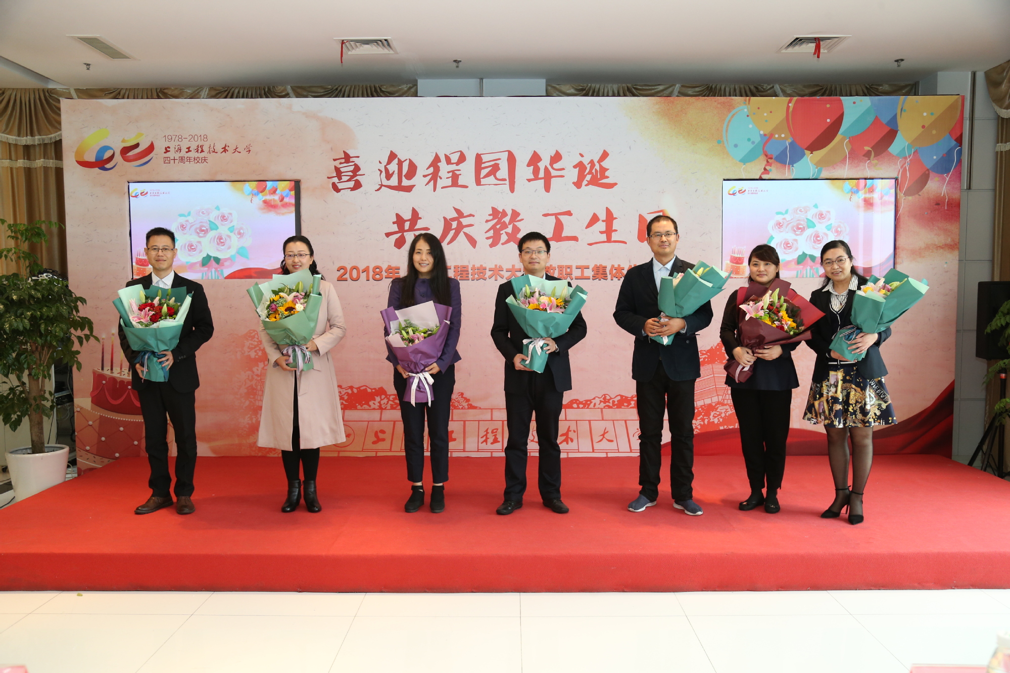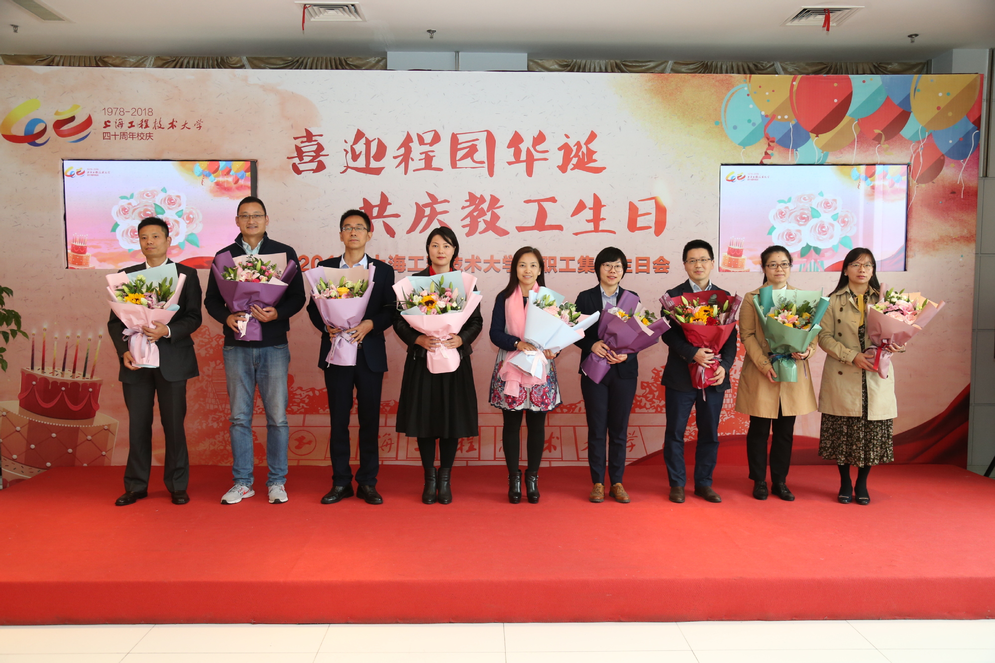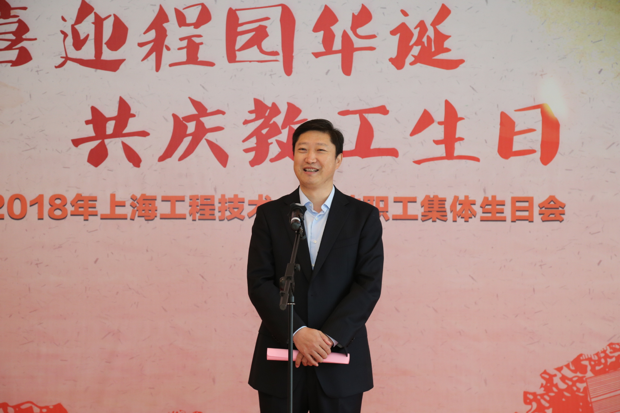 10月22日下午,由校工会主办、数理统计学院、外国语学院承办的“喜迎程园华诞•共庆教工生日”2018年上海工程技术大学教职工集体生日会在行政楼19楼温情举行。校党委书记李江、校党委副书记、工会主席史健勇,各部门教职工代表及逢四十和与校庆同周生日教职工代表、党办、校办、组织部、宣传部、校庆办、人事处、学生处、团委、工会负责人、部分院处负责人、各部门工会主席参加了生日会。