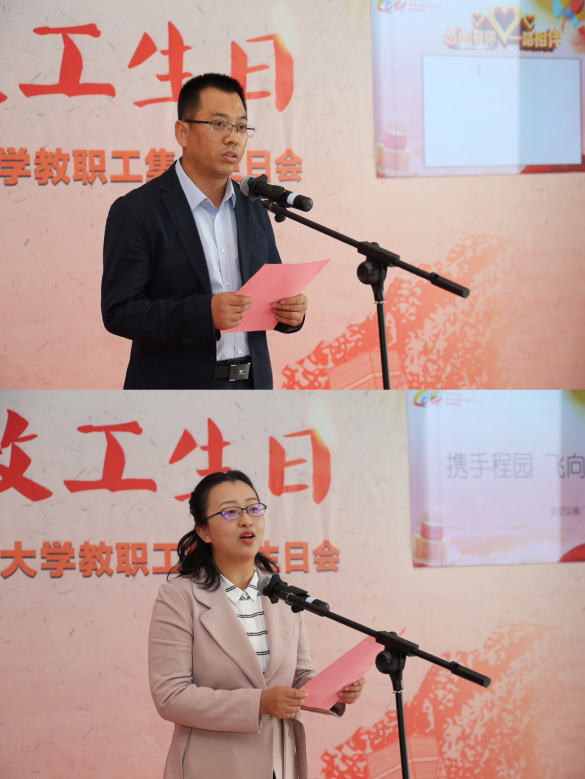 机械与汽车工程学院刘学文和航空运输学院(飞行学院)张兴媛分别代表逢四十周岁和与校庆同周生日的教职工作了发言。来自外国语学院的张冰天、高艳宁等老师带来激情满怀、昂扬向上的诗朗诵《扬帆奋进再出发》。伴随着青年教职工合唱《爱因为在心中》,温情融洽的集体生日会进入了尾声。全体人员上台合影留念,记录下这难忘的一刻。大家在愉快的氛围中度过了这一其乐融融、情谊暖暖的程园集体生日会。为了更好地关心教职工,增进教师之间的情感,让教师真正感受到工程大大家庭的温暖和关怀,学校工会每年为全校全体教职工送上一份蛋糕,同时代表党政送上一份慰问信。
