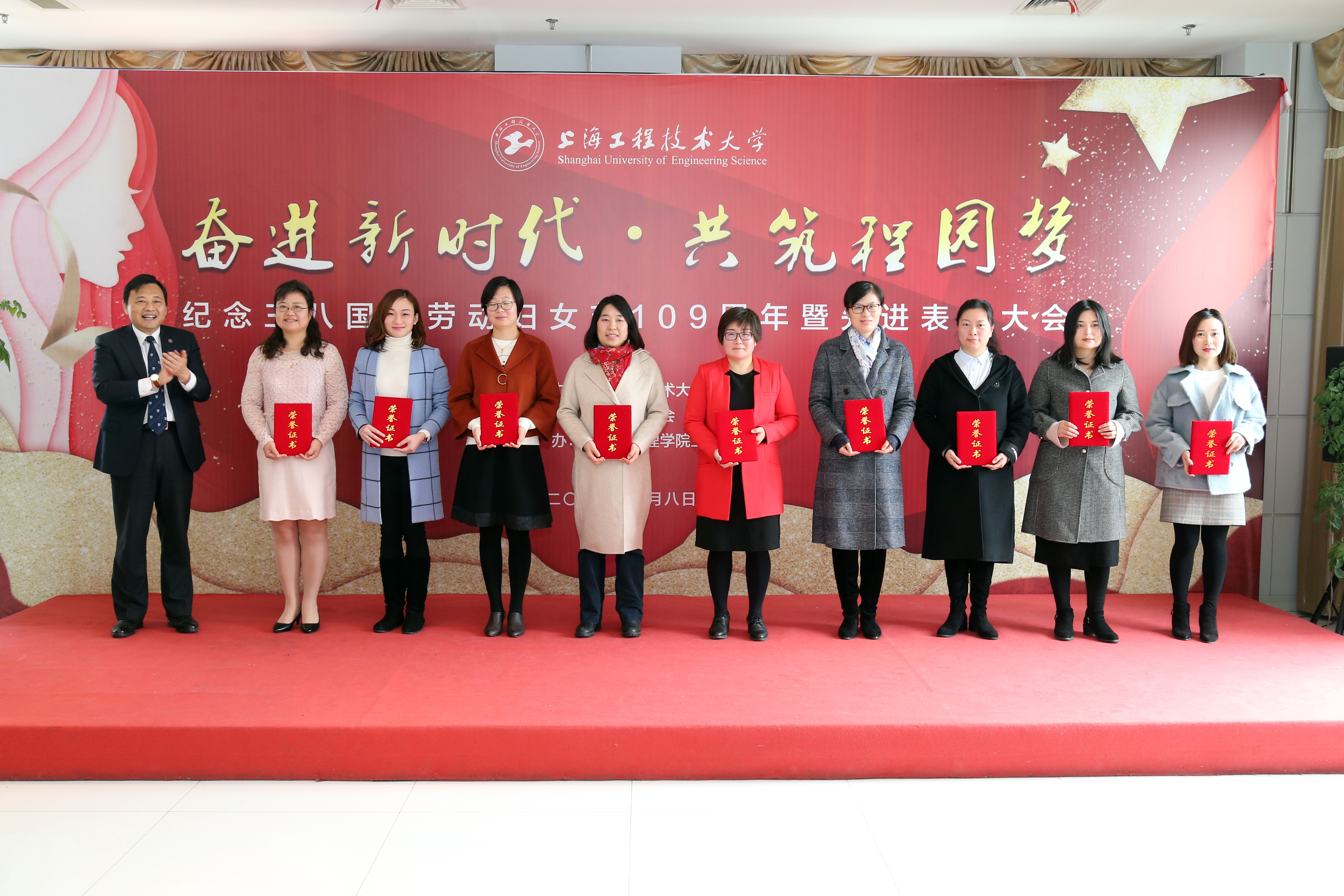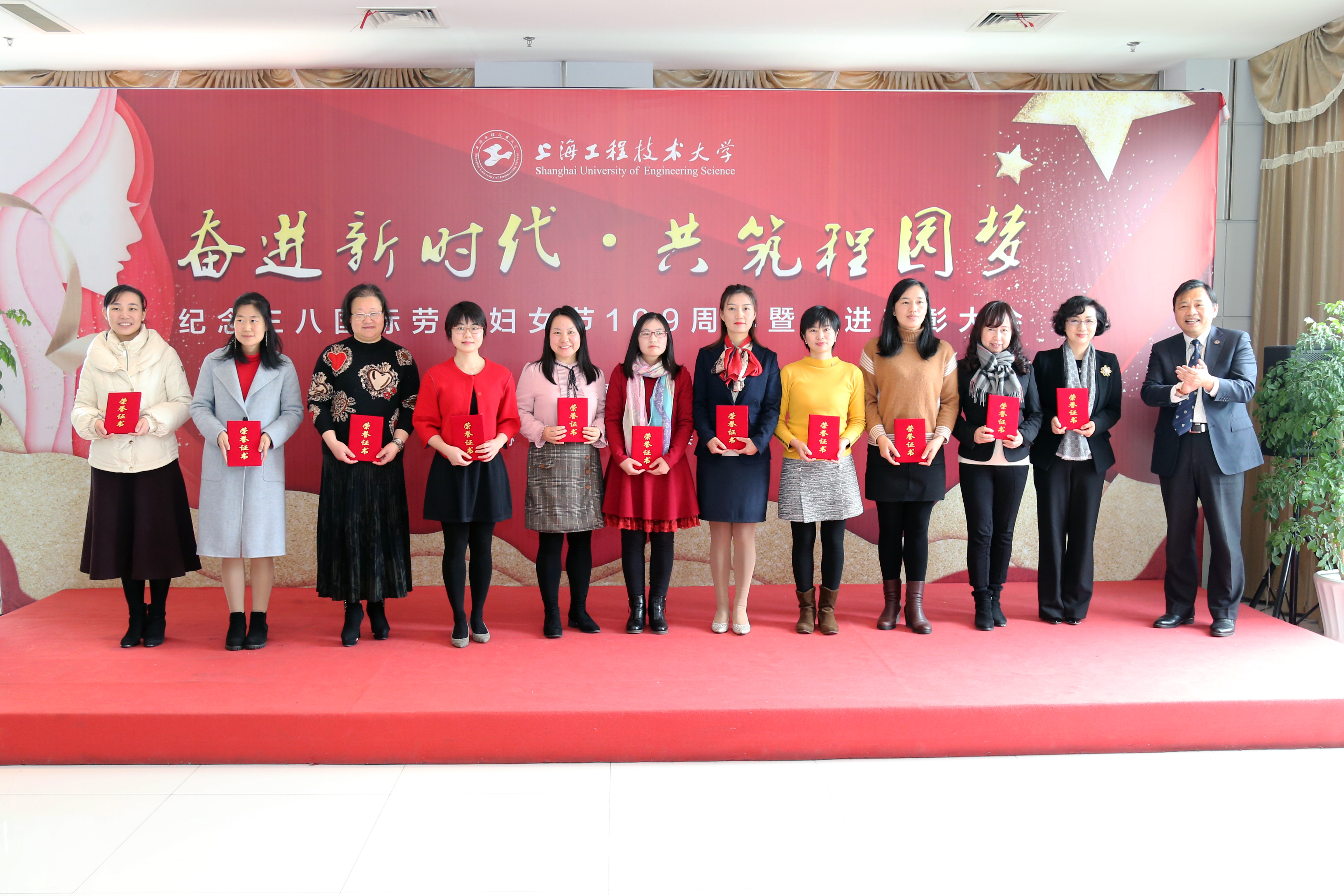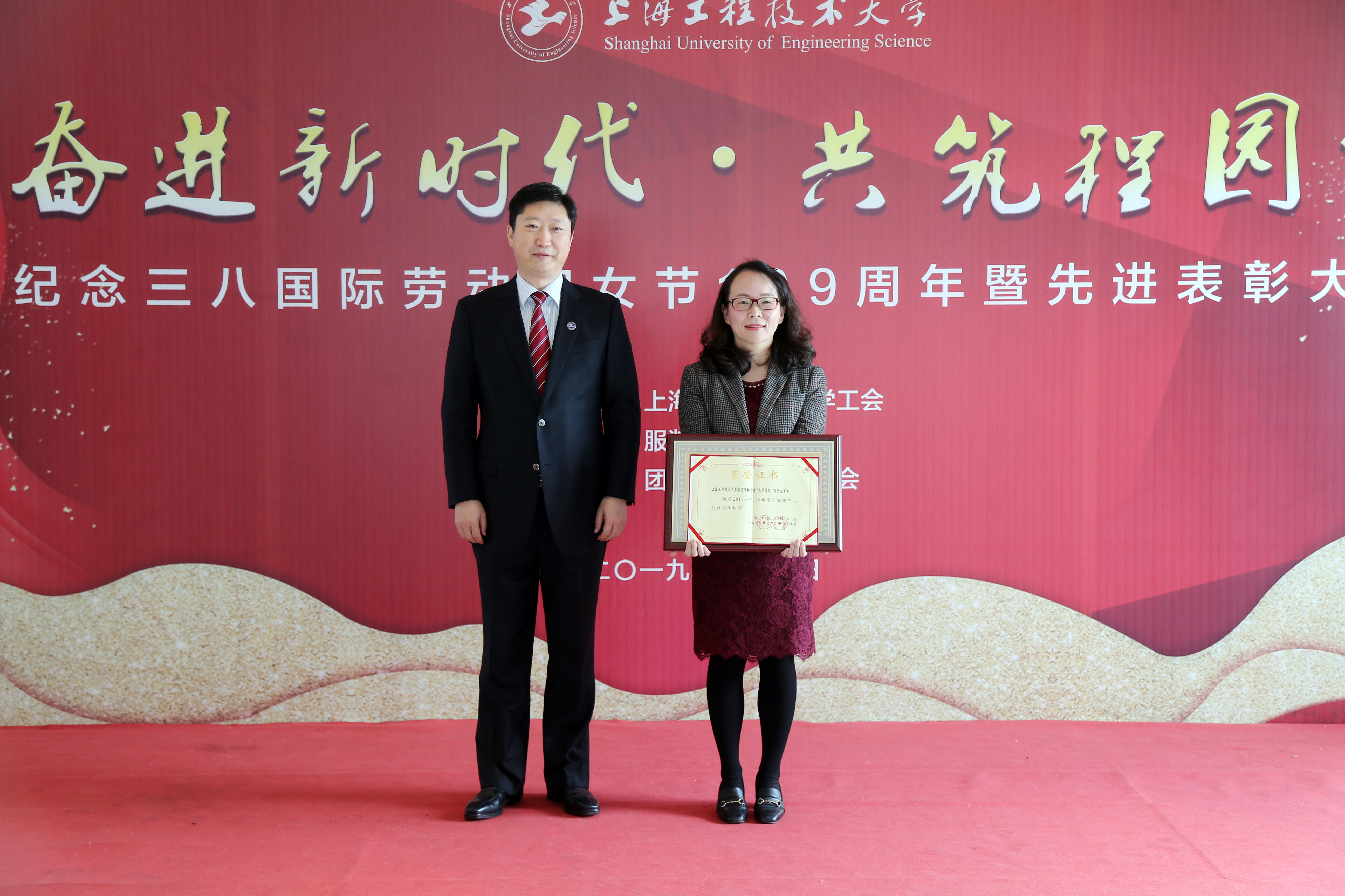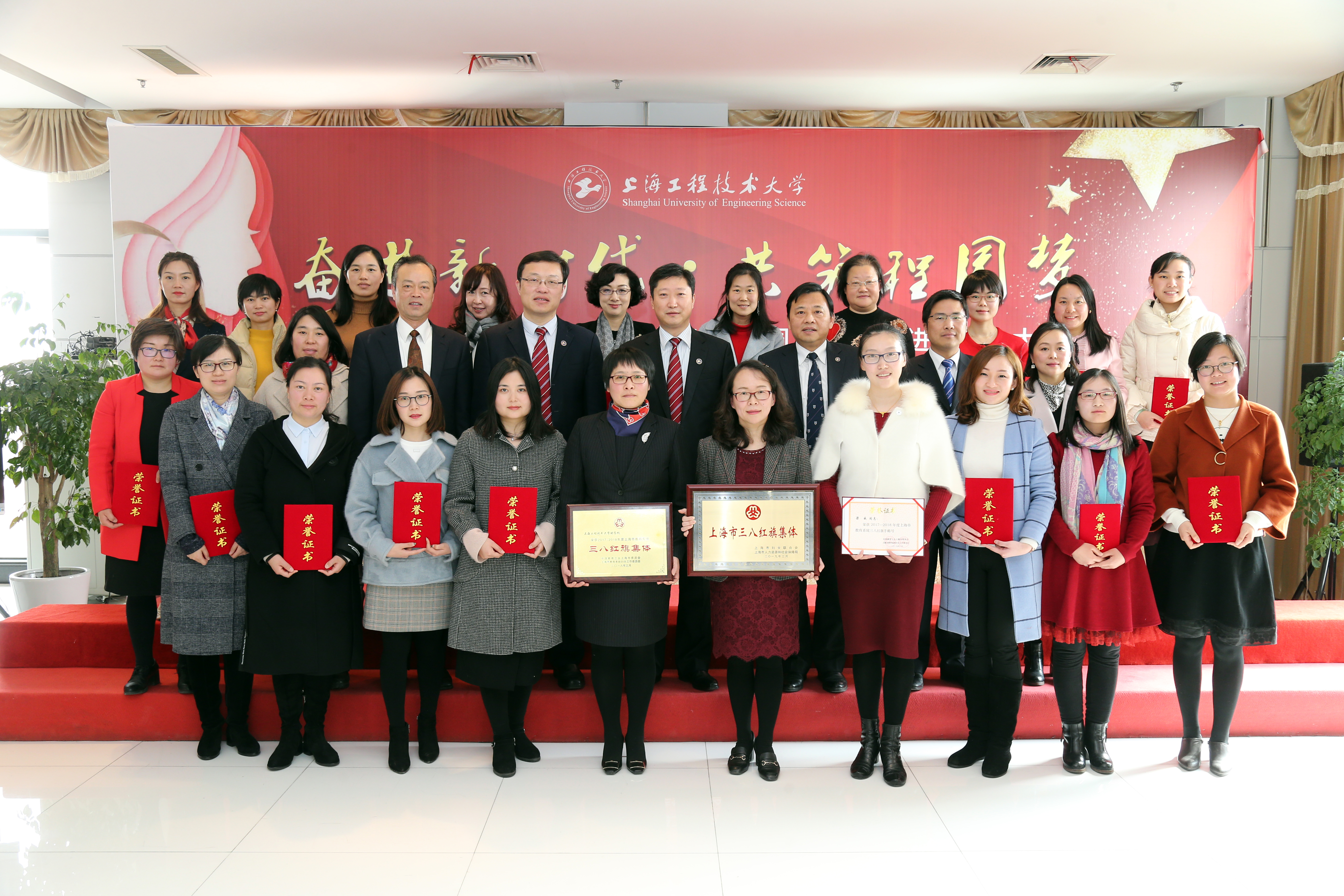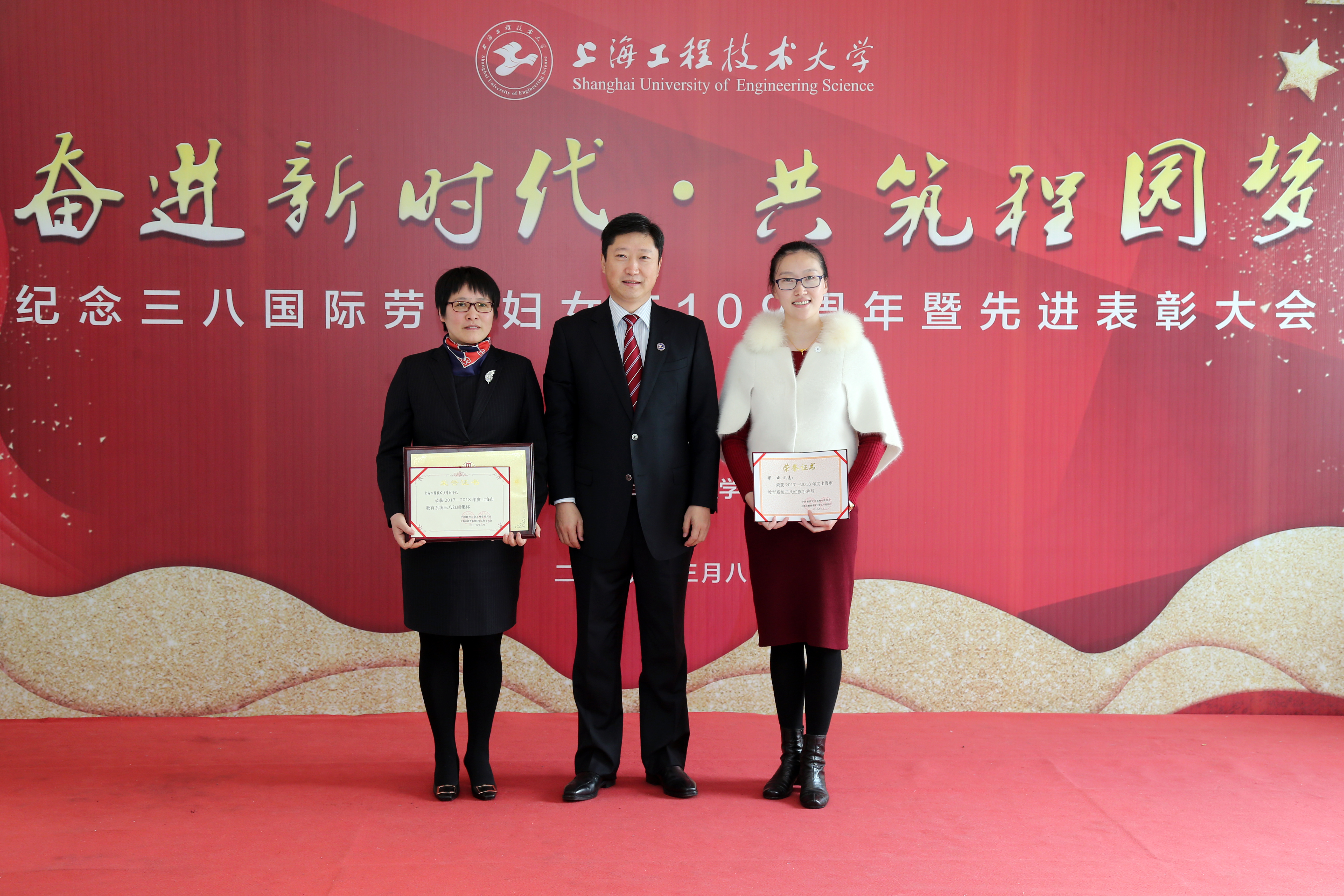 会上,校党委书记李江,校党委副书记、工会主席史健勇分别为2017-2018年度上海市三八红旗集体,上海市教育系统三八红旗手、红旗集体,上海工程技术大学三八红旗手、红旗集体共23位获奖代表颁奖。