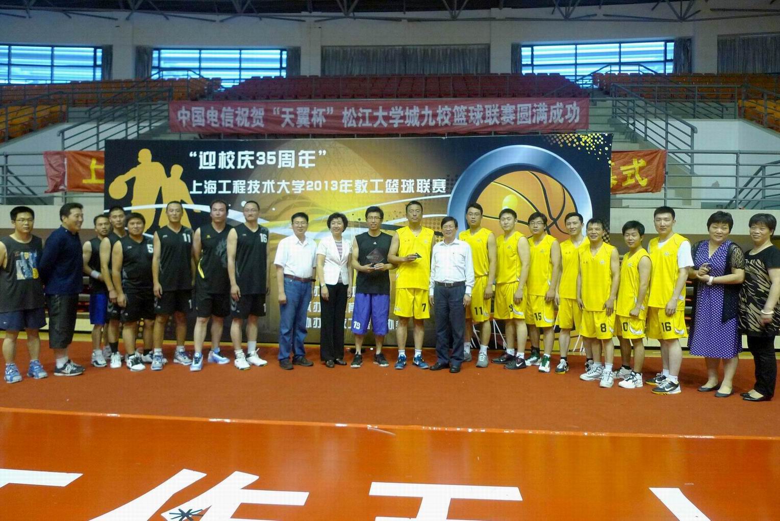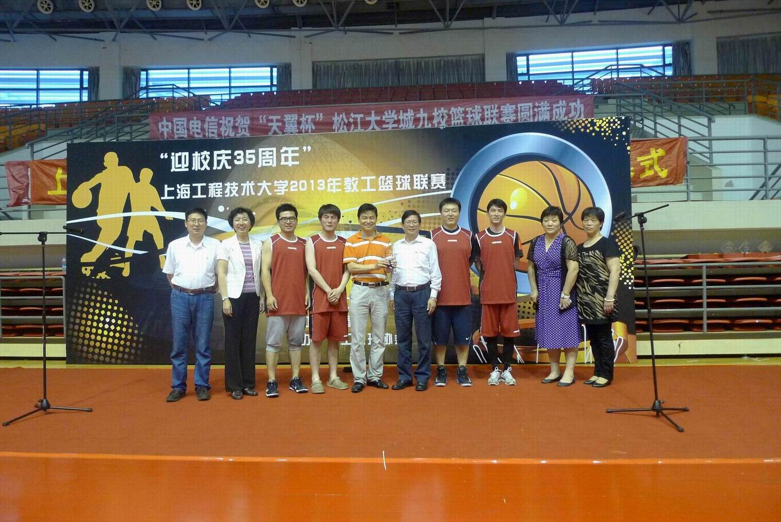 6月7日下午,2013年上海工程技术大学教工篮球赛闭幕式在工程大体育馆隆重举行,整个闭幕式包括比赛和颁奖仪式两个部分。颁奖仪式开始前,校党委副书记、工会主席田信灿、校工会常务副主席沈海庆兴趣盎然地观看了机关队与体育教学部队的篮球比赛。