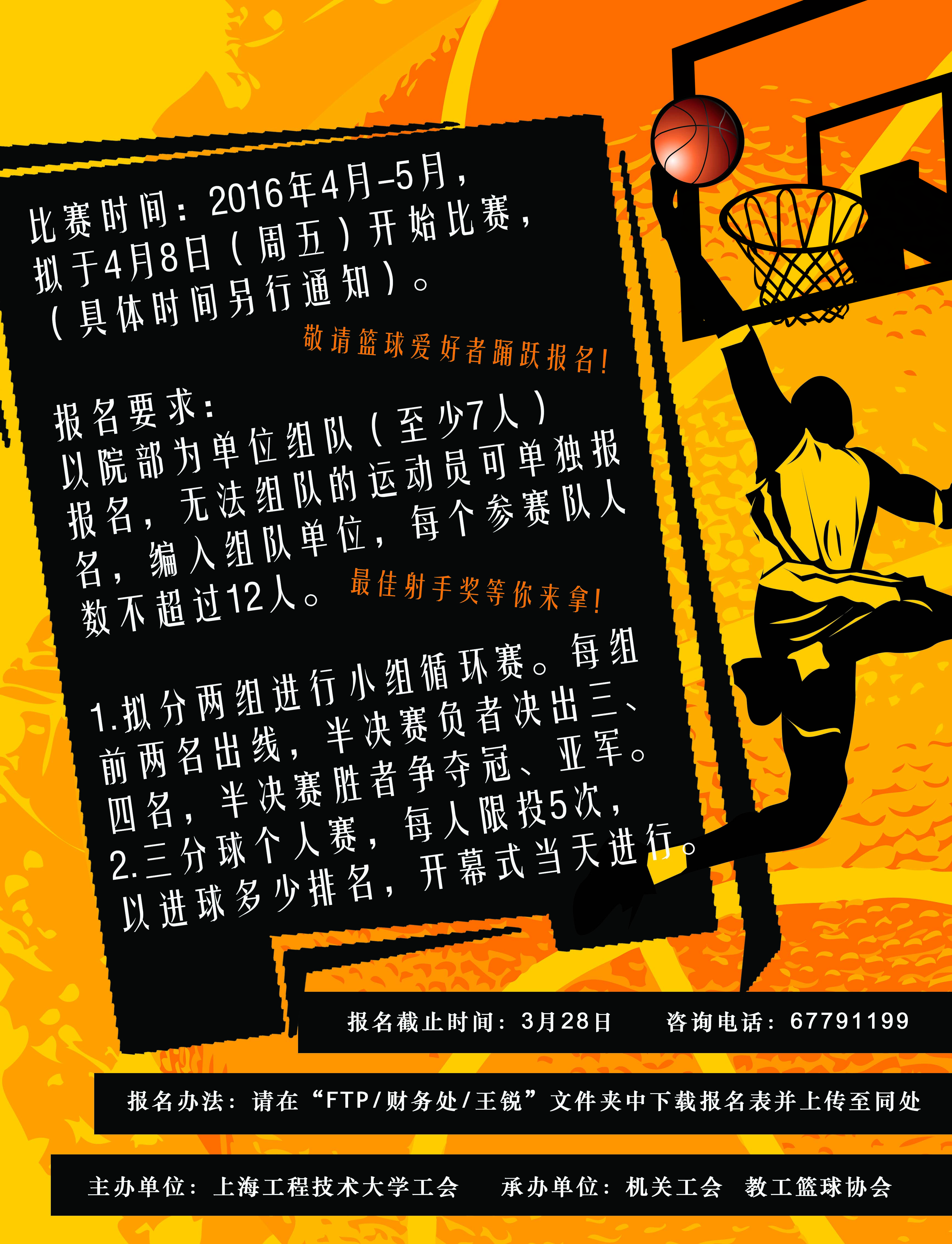 身体健康、适宜参加剧烈运动,具有一定篮球运动技能的在职教工。以院部为单位组队(至少7人)报名,无法组队的运动员亦可单独报名,编入组队单位,每个参赛队人数不超过12人。