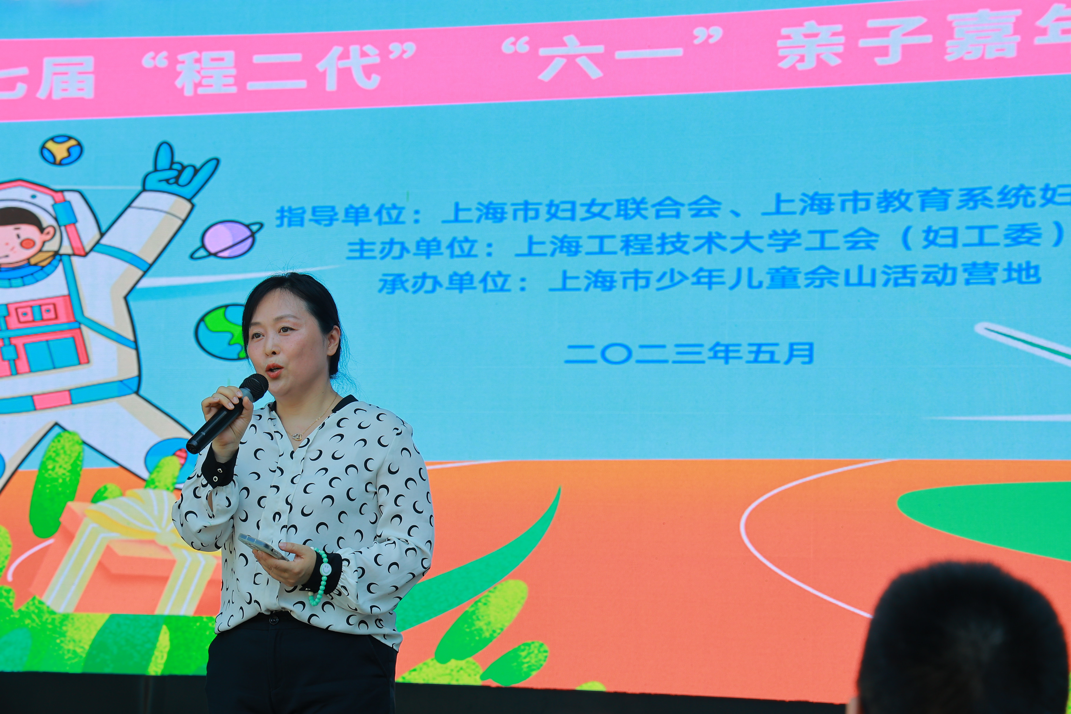 校工会常务副主席、妇工委常务副主任李霞代表学校工会、学校妇工委向参加亲子嘉年华活动的老师孩子们表示欢迎并致以节日祝福。希望通过主题活动,点燃“程二代”心中的爱国主义情怀,从小树立科技强国梦想,长大报效祖国,成就精彩人生。