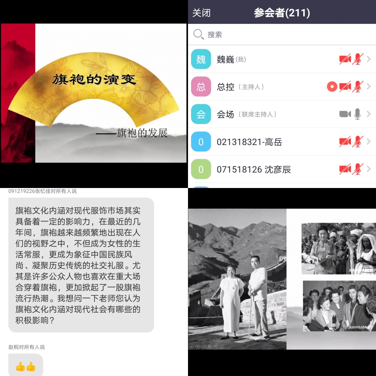 汪老师以海派旗袍文化的历史演变为脉络,用优雅的语言、写实的历史图片讲述了海派旗袍服饰和旗袍文化的变迁,通过生动的视频回顾了大清朝的袍服、民国汉人服饰、三四十年代学生旗袍、十里洋场的海派旗袍以及当今时尚改良旗袍的服饰特点和时代风貌。虽然是云讲座,同学们对学习旗袍文化知识、探求美好事物的兴趣依然高涨,不时举手或留言提问。汪老师耐心聆听同学们的问题、思考和想法,并对“旗袍文化内涵对现代社会的影响”、“旗袍从传统走向现代的历史意义”等话题分享了个人见解,引发同学们的共鸣。在最后旗袍展示环节,来自海派旗袍文化促进会的女企业家、首次体验牛仔时尚旗袍的青年教工分别分享了自己的体会以及与旗袍的情缘故事。