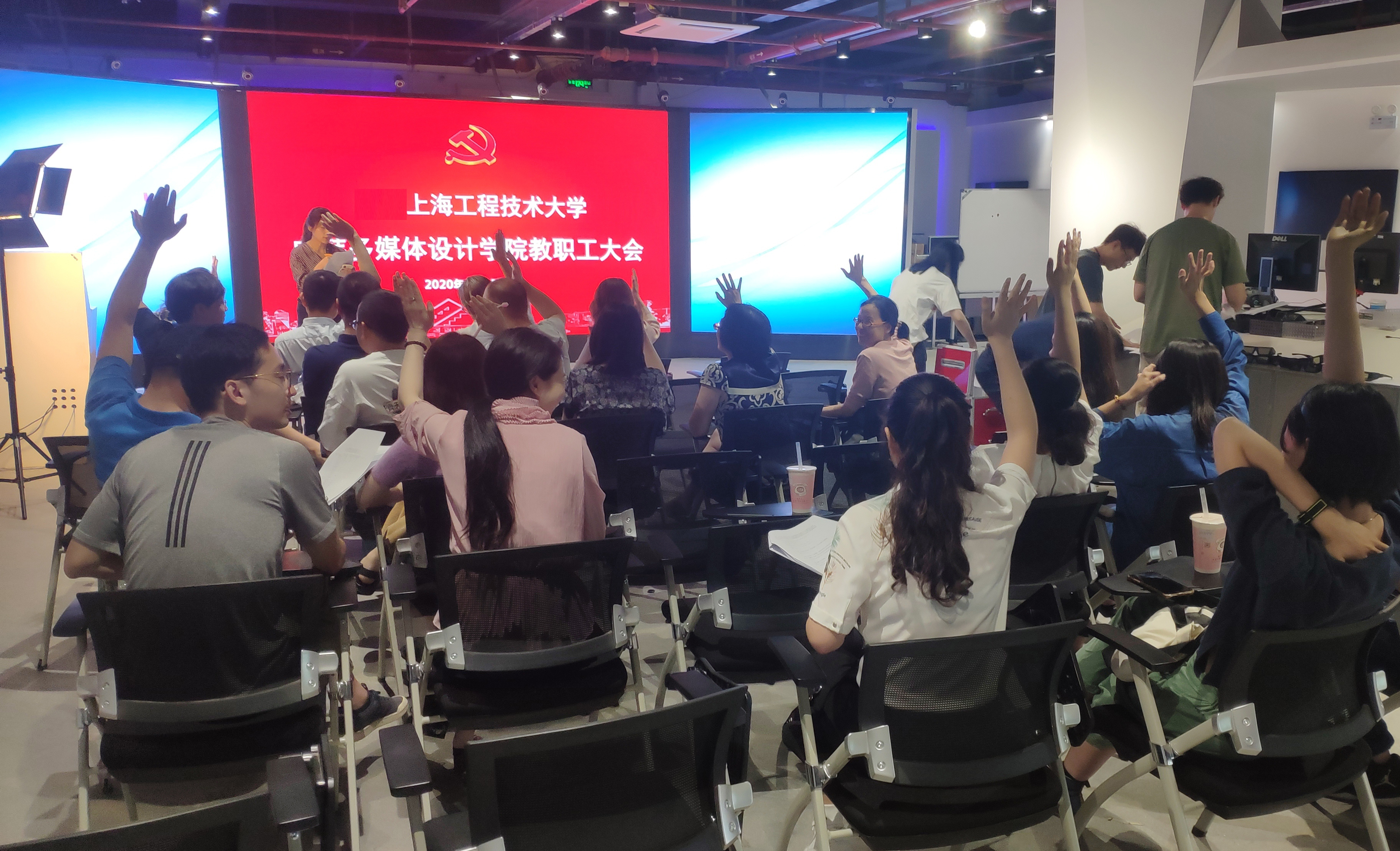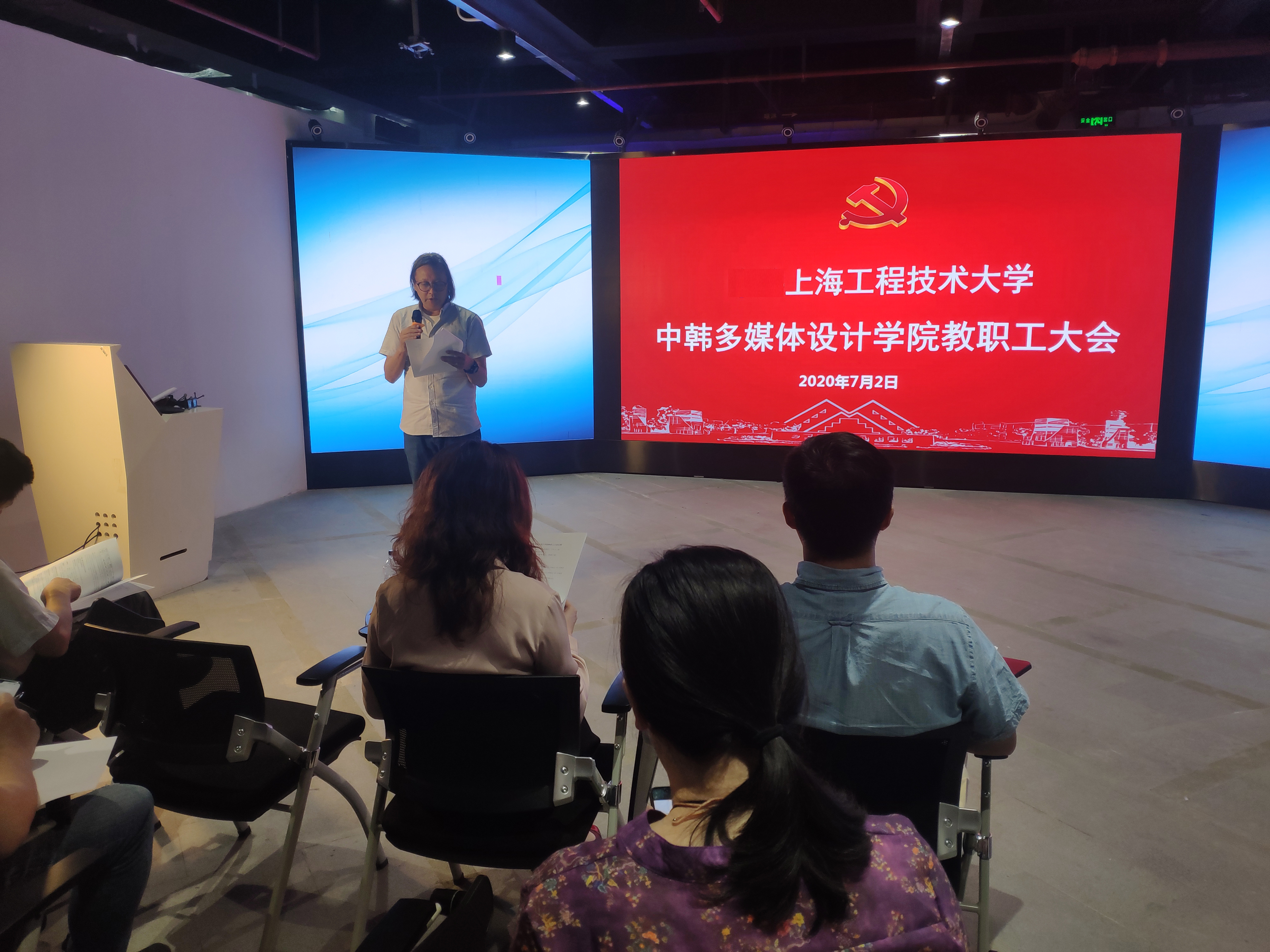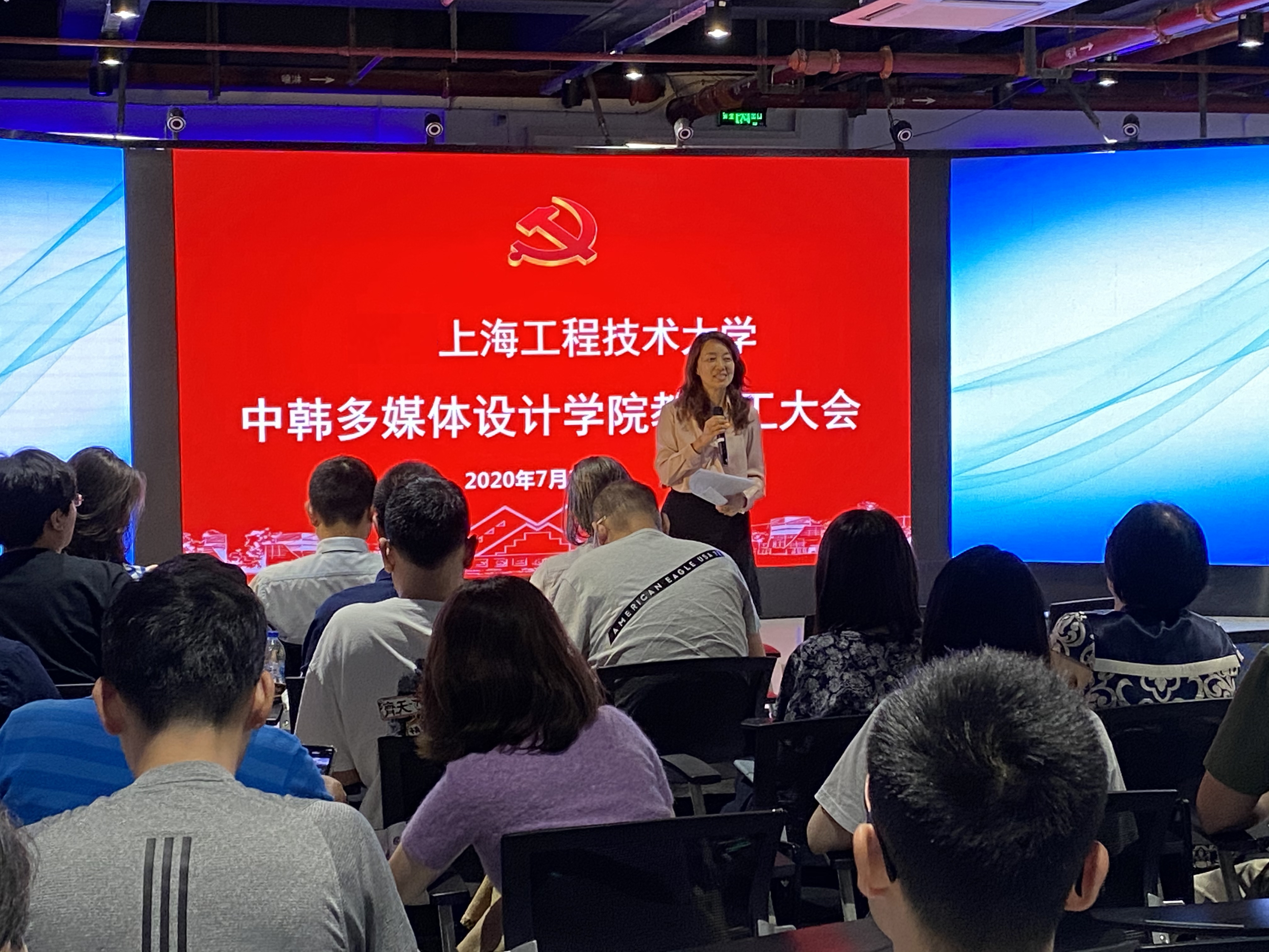 中韩多媒体设计学院教职工大会于7月2日在艺术楼一楼隆重举行。艺术设计学院党委书记袁蓉、中韩多媒体设计学院院长吴亚生、学院全体党政班子成员、教职工出席了会议。会议由中韩多媒体设计学院党政办公室主任,艺术设计学院、中韩多媒体设计学院联合工会副主席苌欣主持。